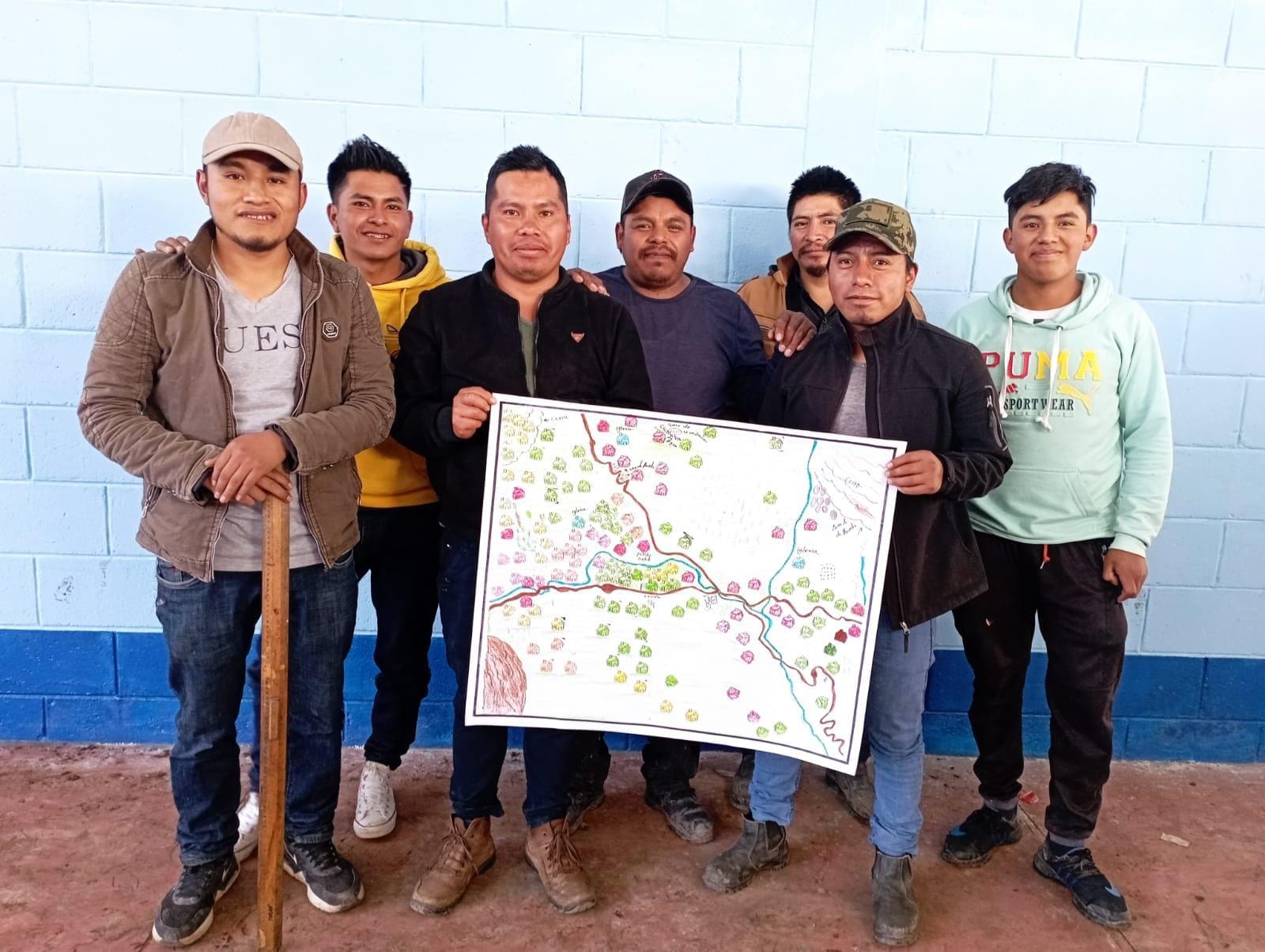Don Marcos (front left) holds a community risk map created with other citizens from the village of Santa Eloisa Chitamil in San Juan Ixcoy.