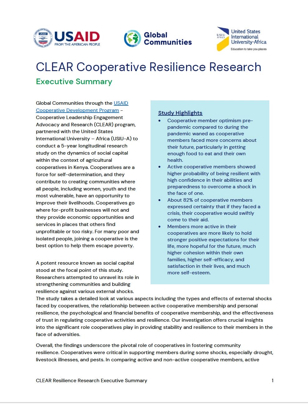 Global Communities through the USAID Cooperative Development Program -Cooperative Leadership Engagement Advocacy and Research (CLEAR) program, partnered with the United States International University – Africa (USIU-A) to conduct a 5-year longitudinal research study on the dynamics of social capital within the context of agricultural cooperatives in Kenya.Â