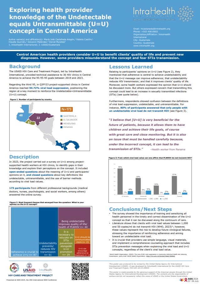 This poster, presented in 2024 at the 25th International AIDS Conference by IntraHealth International – Global Communities’ subsidiary – highlights the results of an exploratory survey about the knowledge and opinions of health providers in Central America on the Undetectable Equals Untransmittable (U=U) concept.Â