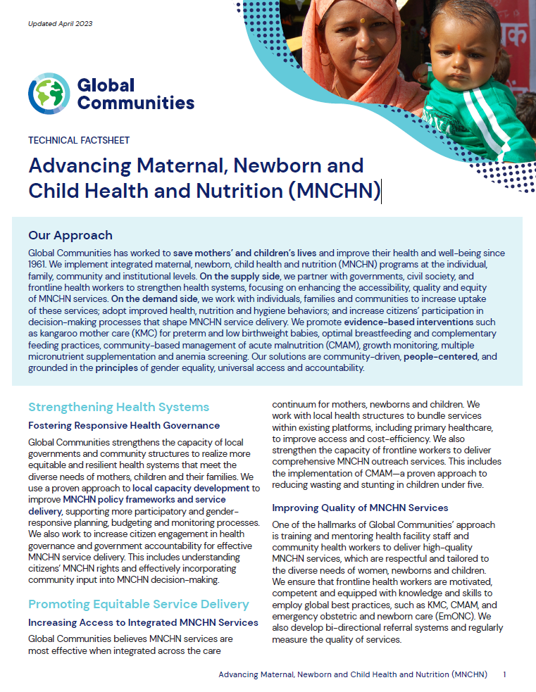 Global Communities has worked to save mothers’ and children’s lives and improve their health and well-being since 1961. We implement integrated maternal, newborn, child health and nutrition (MNCHN) programs at the individual, family, community and institutional levels. On the supply side, we partner with governments, civil society, and frontline health workers to strengthen health systems, focusing on enhancing the accessibility, quality and equity of MNCHN services. On the demand side, we work with individuals, families and communities to increase uptake of these services; adopt improved health, nutrition and hygiene behaviors; and increase citizens’ participation in decision-making processes that shape MNCHN service delivery. We promote evidence-based interventions such as kangaroo mother care (KMC) for preterm and low birthweight babies, optimal breastfeeding and complementary feeding practices, community-based management of acute malnutrition (CMAM), growth monitoring, multiple micronutrient supplementation and anemia screening. Our solutions are community-driven, people-centered, and grounded in the principles of gender equality, universal access and accountability.